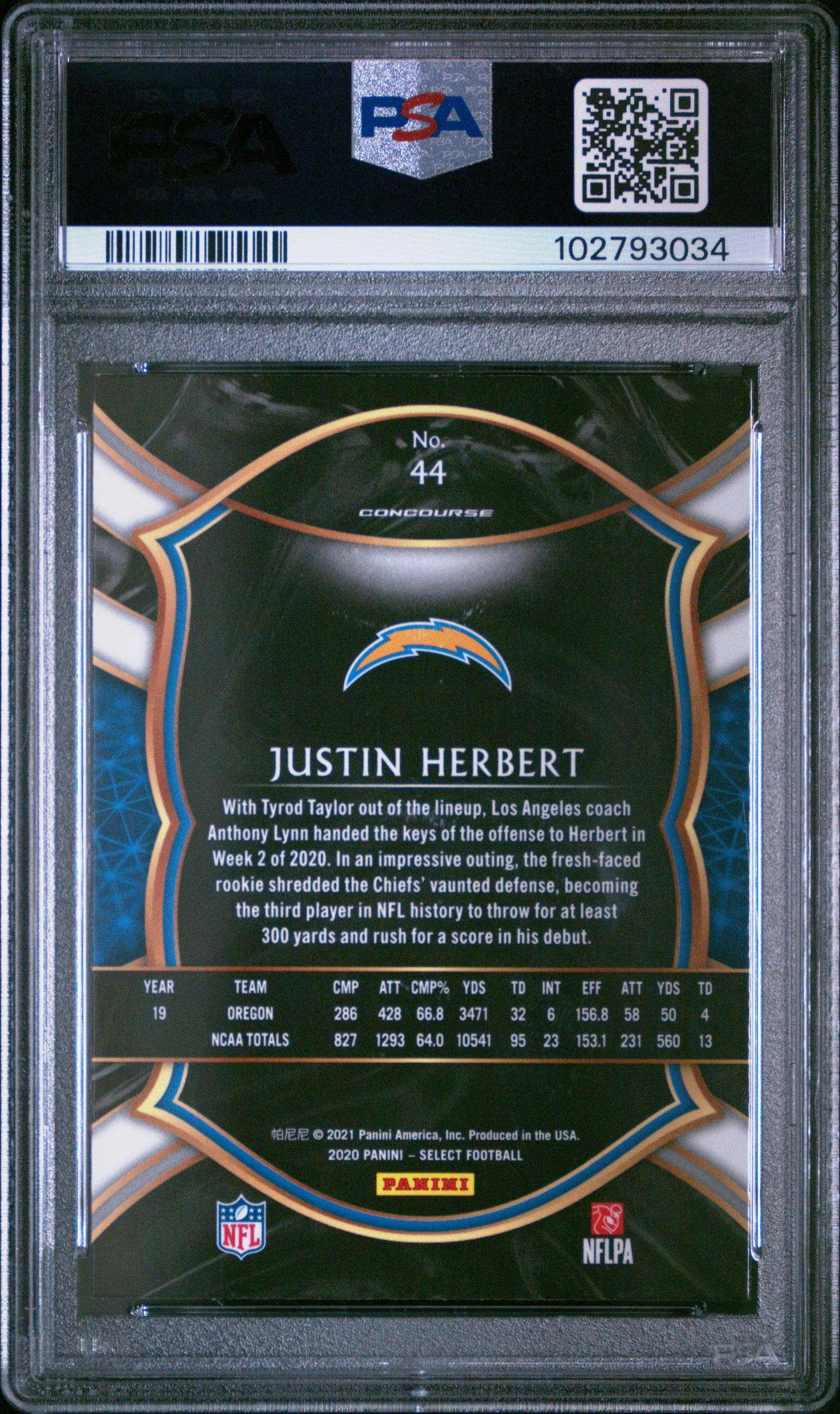 You are purchasing a 2020 Panini Select Justin Herbert #44 PSA 10. You will receive the exact item in the photographs. Orders are processed and shipped within 2 business days. Tracking information will be added to your order once available. We take pride in delivering exceptional service through both our fulfillment quality control and prompt communication. If you're not 100% satisfied with your order, please contact us directly as we’re confident we can resolve any issues. Positive 5 star reviews are always greatly appreciated. Thank you for choosing Graybo’s Sports Cards! Listed With Mascot.