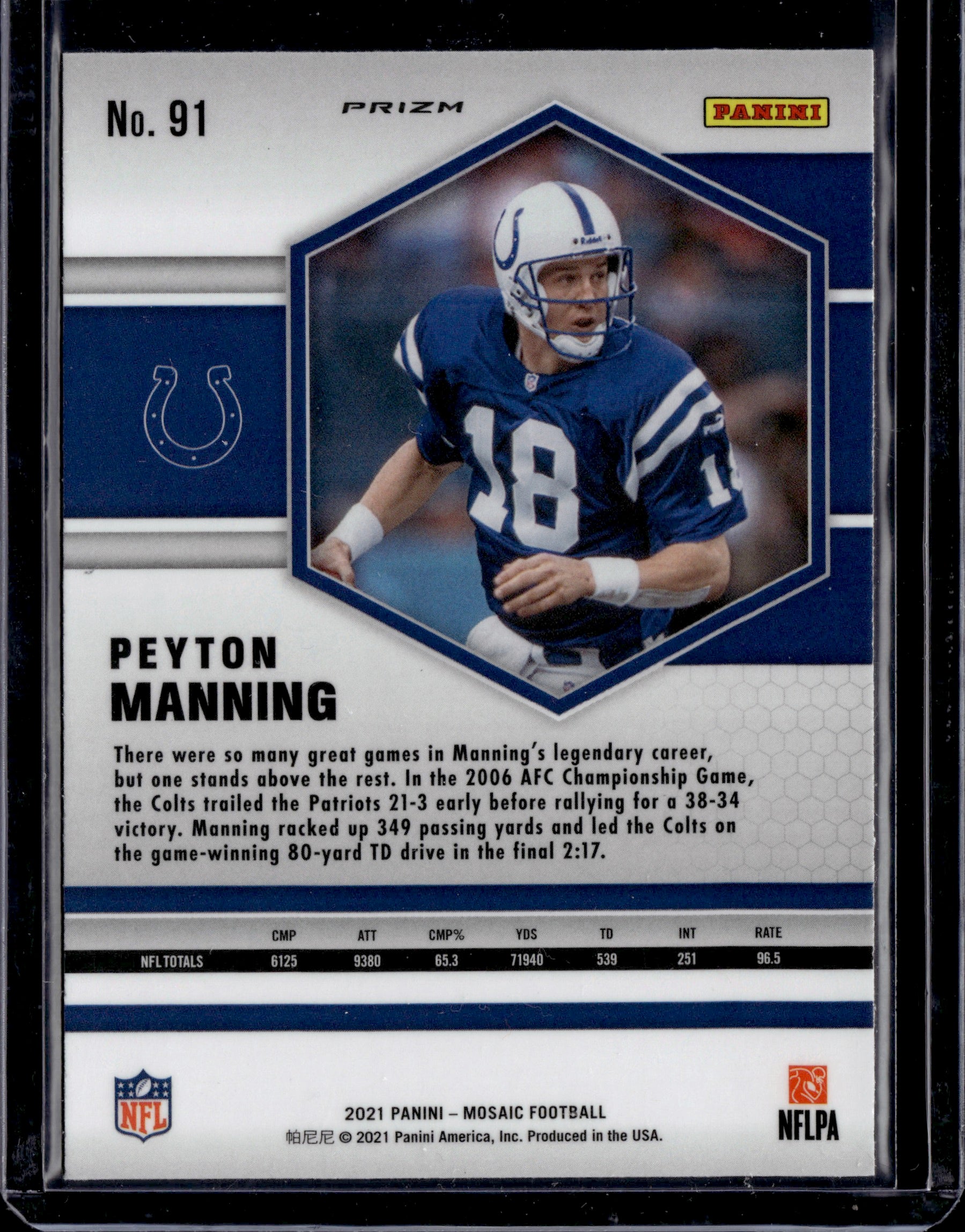 You are purchasing a 2021 Panini Mosaic Football Peyton Manning #91 Silver Prizm. You will receive the exact item in the photographs. Orders are processed and shipped within 2 business days. Tracking information will be added to your order once available. We take pride in delivering exceptional service through both our fulfillment quality control and prompt communication. If you're not 100% satisfied with your order, please contact us directly as we’re confident we can resolve any issues. Positive 5 star reviews are always greatly appreciated. Thank you for choosing Graybo’s Sports Cards! Listed With Mascot.