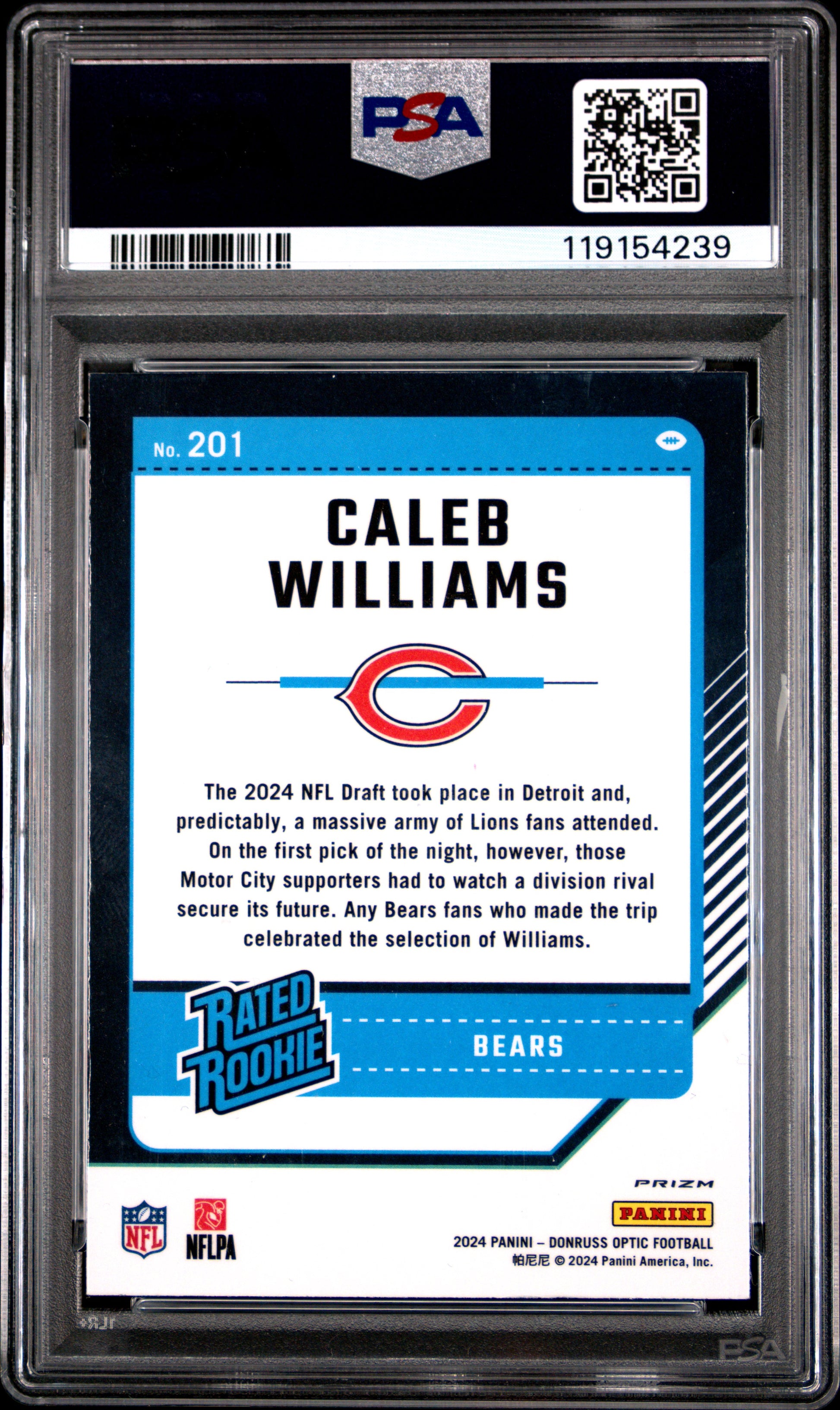 You are purchasing a 2024 Panini Donruss Optic Caleb Williams #201 Pink PSA 9. You will receive the exact item in the photographs. Orders are processed and shipped within 2 business days. Tracking information will be added to your order once available. We take pride in delivering exceptional service through both our fulfillment quality control and prompt communication. If you're not 100% satisfied with your order, please contact us directly as we’re confident we can resolve any issues. Positive 5 star reviews are always greatly appreciated. Thank you for choosing Graybo’s Sports Cards! Listed With Mascot.