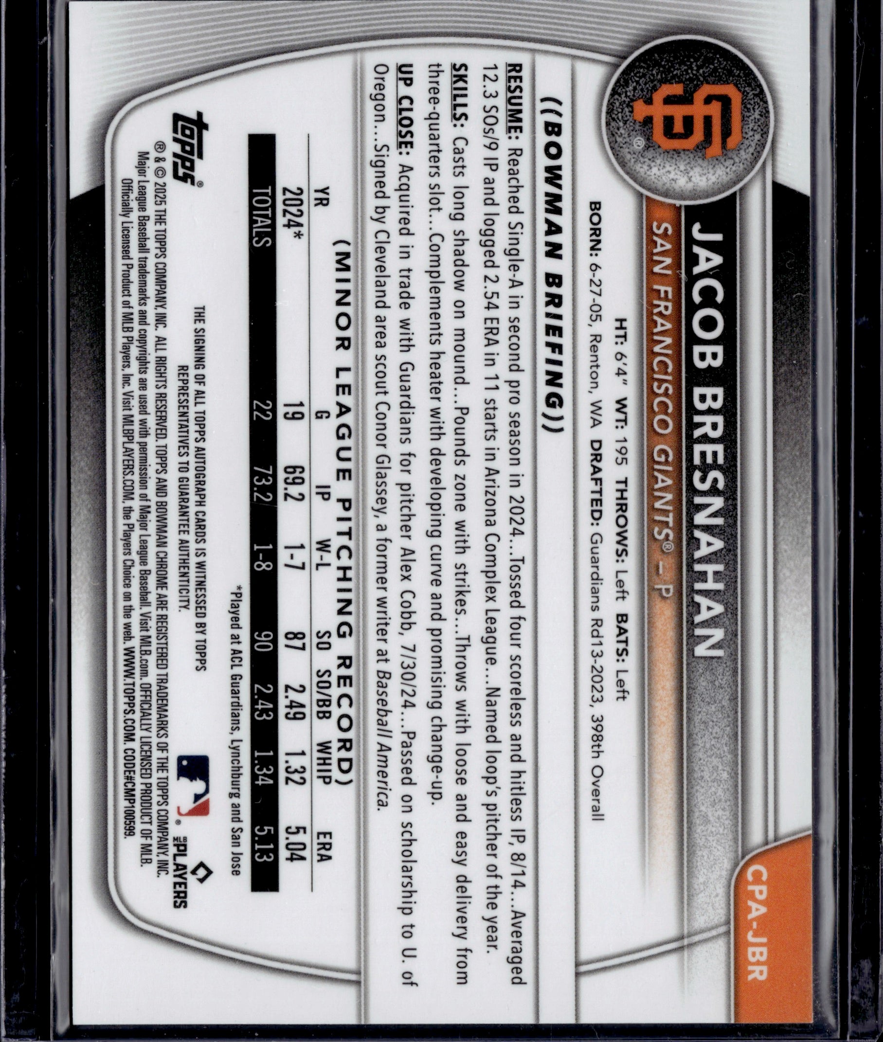 2025 Topps Bowman Chrome Jacob Bresnahan #CPA-JBR Gold Shimmer Auto /50